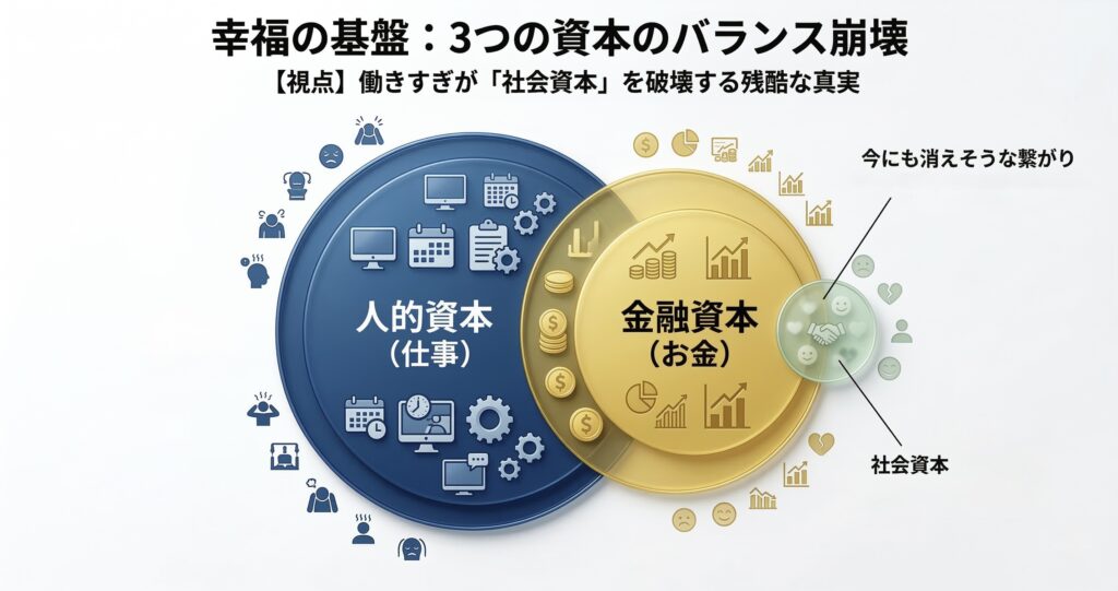 本書を読んで確信したのは、「働きすぎの最大の弊害は、幸福の基盤である『社会資本(友人関係)』が破壊されること」です。 人間の幸福は「人的・金融・社会資本」のバランスで成り立ちます。しかし、多くの人は「あと1年だけ」と仕事を優先し、大切な友人との時間を削ります。その結果、配偶者に先立たれた後、お金はあっても孤独という最悪の結末を迎えるのです。