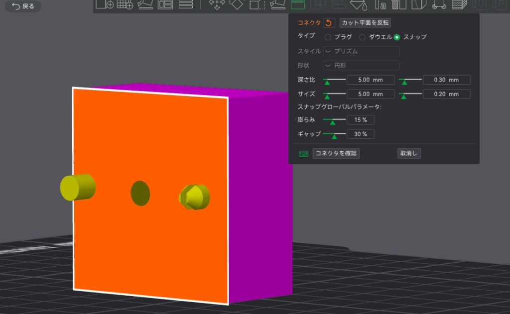 • 最大のネック・つまずいた点: ダウエルを使うためには、大元の設計段階で「ダボ穴を開けられるだけの壁の厚み」を確保しておく必要があります。また、スライサーが自動生成したピンをそのまま「垂直」に印刷すると、積層の境目で簡単にポキッと折れます。