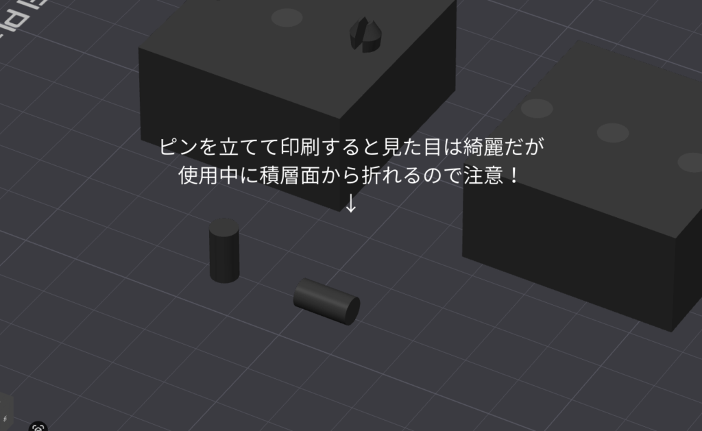 • 別刷りのピン(ダボ)は、積層割れを防ぐために必ず「寝かせて印刷」すること。