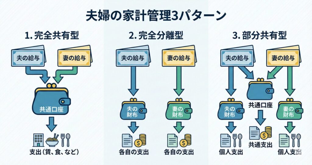- 夫婦の家計管理には「完全共有・完全分離・部分共有」の3パターンがあり、どれが正解かは収入差・金銭感覚・働き方・将来設計によって変わる。