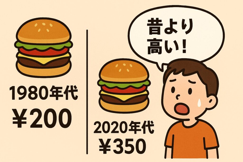 1980年代はハンバーガー1個が200円前後でしたが、現在は300〜400円台も珍しくありません。これがインフレによる購買力低下のわかりやすい例です。
