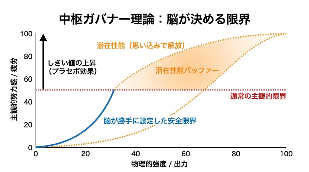 疲労は筋肉の限界ではなく、脳が身体を保護するために作り出した「感情」であるという理論。プラセボによって「これは効く」と思い込むと、脳のリミッターが外れ、本来持っている潜在能力(残り20から30パーセント)を解放できることが実験で証明されています。