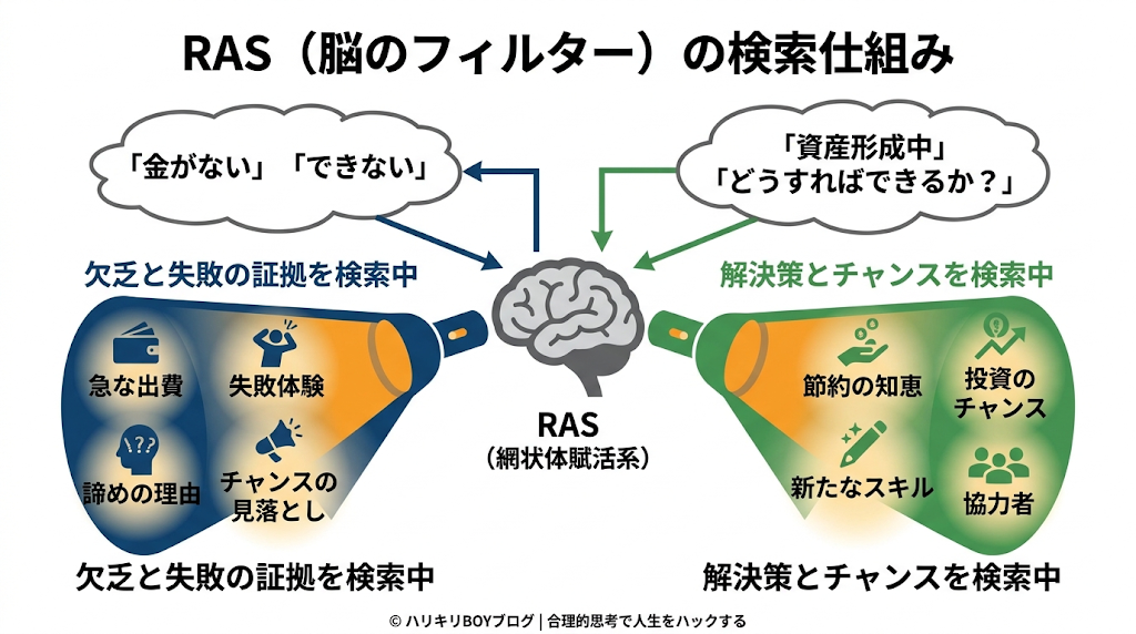 脳には自分が必要と判断した情報だけを拾うフィルターがあります。「金がない」「もう若くない」「時間がない」と言い続けると、脳は「できない理由」ばかりを検索し、解決のチャンスを「不要な情報」として視界から切り捨ててしまいます。
