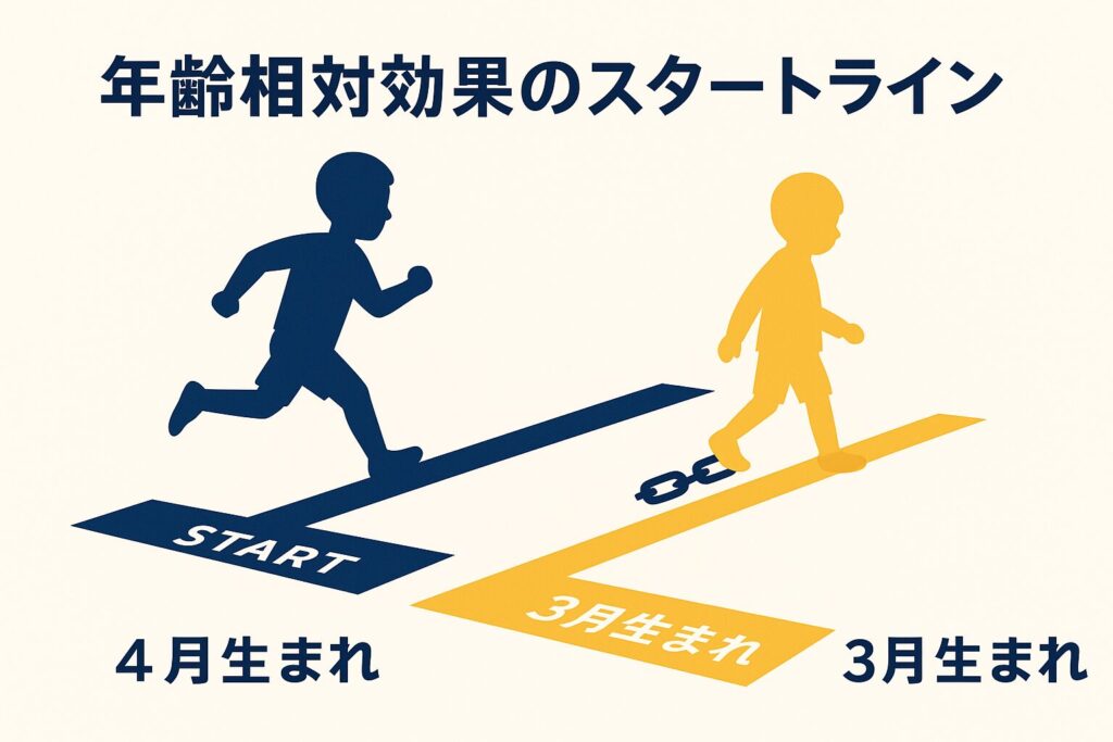 年齢相対効果とは、同じ学年の中で誕生日の早い子と遅い子の間に最大で1年ほどの発達差が生まれ、その差がスポーツや学業の結果、さらには自己評価にまで影響する現象です。身体の大きさや集中力、読み書きのスピードなどは、幼少期ほど月齢の差がはっきり出ます。