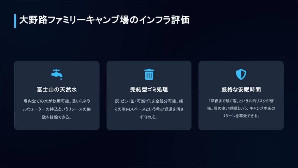 - 理由1:インフラの完全性。水洗場は富士山の天然水が引かれ飲用可能。灰・ビン・缶を含むゴミ処理が場内で完結し、帰りの積載を圧迫しない。さらに安眠時間が厳守されており、深夜の騒音トラブルがない。