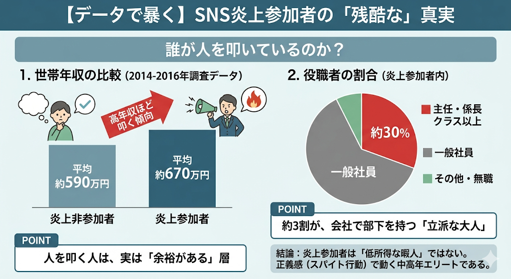 「ネットで誹謗中傷をしているのは底辺の暇人だ」というのは完全に誤りです。大規模な調査データによれば、炎上参加者の平均世帯年収は非参加者より高く、約3割が主任・係長クラス以上の役職者です。彼らは嫉妬や暇つぶしではなく、「間違ったやつに罰を与える」という歪んだ正義感(スパイト行動)で動いています。
