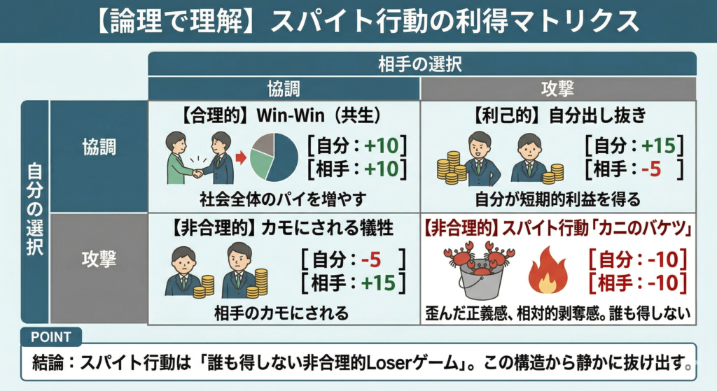 結論:日本の閉塞感の正体は「自分が損をしてでも相手の利益を破壊する」というスパイト行動です。だからこそ、私はこの不毛なゲームから意図的かつ戦略的に降りる選択をしています。
