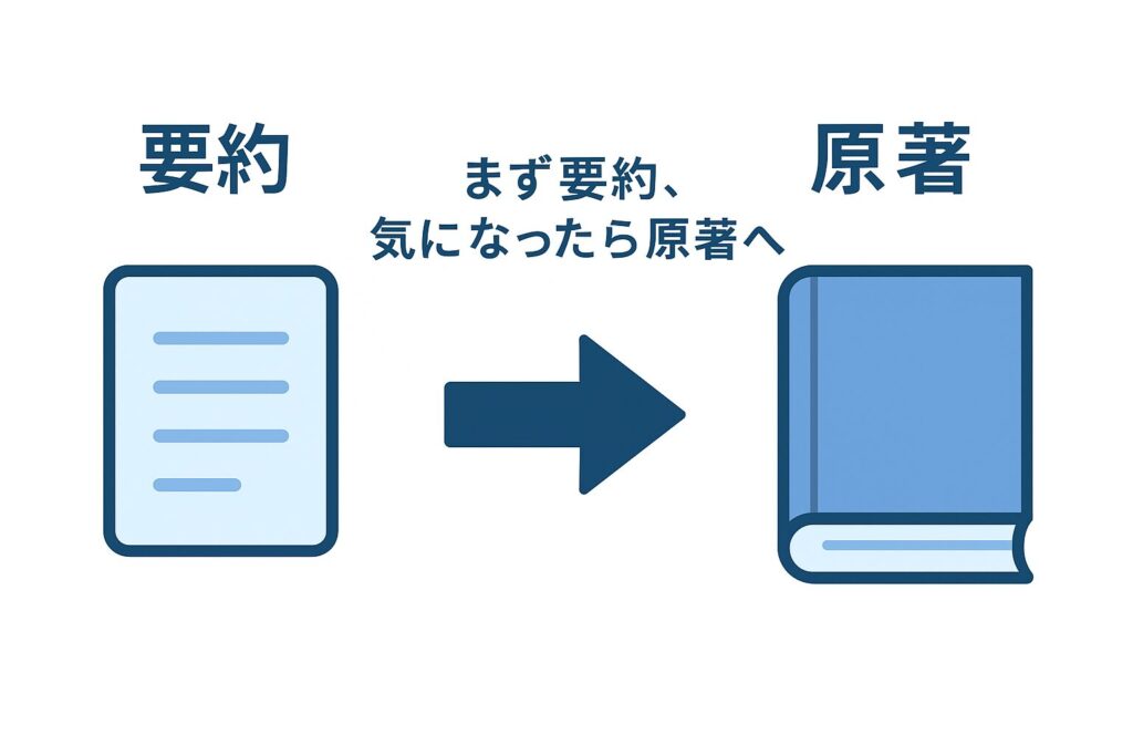 - 要約=結論の理解、原著=雑学を含めた思考の拡張